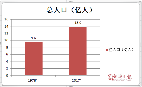 ↑1978年我国总人口9.6亿,2017年达到13.9亿,增加4.3亿人,平均每年增加1000多万人。