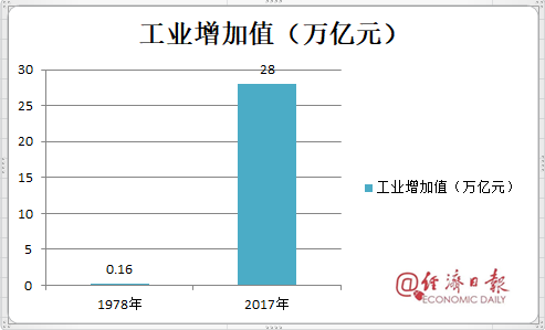 ↑1978年工业增加值仅有1622亿元。2017年工业增加值接近28万亿元,按可比价计算,比1978年增长53倍,年均增长10.8%。