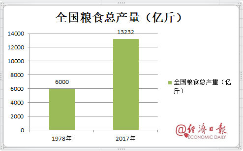 ↑1978年全国粮食总产量仅有6000多亿斤,2017年全国粮食总产量增至13232亿斤。近年来,我国谷物、肉类、花生、茶叶产量稳居世界第一位。
