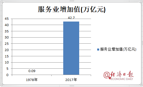 ↑1978-2017年,我国服务业增加值从905亿元增长到427032亿元,年均实际增长10.5%,对国民经济增长的贡献率从28.4%上升至58.8%,成为国民经济第一大产业和经济增长的主动力。