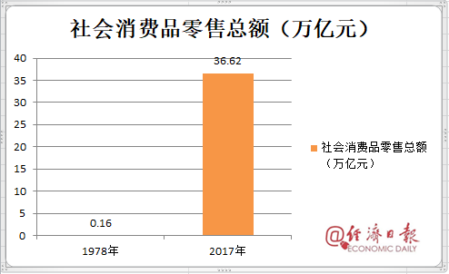 ↑社会消费品零售总额由1978年的1559亿元增加到2017年的366262亿元,年均增长15.0%。