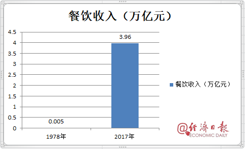 ↑2017年,社会消费品零售总额中餐饮收入39644亿元,较1978年增了722倍。