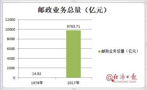 ↑1978年,我国邮政业务总量14.92亿元,2017年,邮政业务总量达9763.71亿元。其中,到2017年末,快递业务总量由1988年的153万件激增至400.56亿件,保持全球第一。