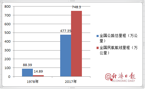 ↑2017年末,全国公路总里程达到477.35万公里,是1978年的5.4倍,年均增长4.4%;2017年末,航线里程748.30万公里,40年年均增长10.6%。