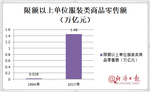 ↑2017年,限额以上单位服装类商品零售额为14557亿元,较1978年增长51倍。