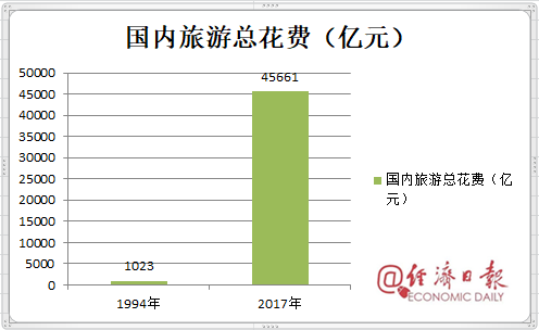 ↑旅游从曾经的“奢侈品”转变为人民日常“生活元素”。2017年,国内旅游总花费45661亿元,比1994年增长了43.6倍。