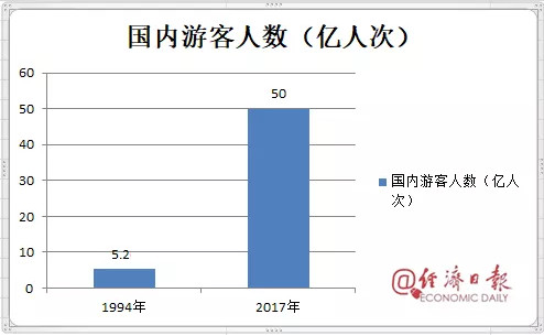 ↑2017年,我国国内游客50亿人次,比1994年增长约8.5倍。
