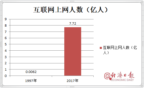 ↑我国互联网上网人数由1997年的62万人激增至2017年的7.72亿人,年均增长42.8%;我国互联网普及率达到55.8%,超过全球平均水平4.1个百分点。
