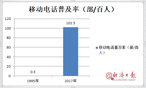 ↑全国固定电话普及率由1978年的0.4部/百人提高到2017年的14.0部/百人;移动电话普及率由1995年的0.3部/百人提高到2017年的102.5部/百人。