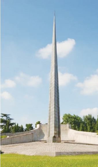 苏中七战七捷纪念碑位于江苏省海安县苏中七战七捷纪念馆内。纪念碑碑身如一把直耸云霄的刺刀,用古铜色天然花岗岩拼接砌成,拔地而起,直刺蓝天,象征着当年新四军指战员驰骋华中战场的那种英雄气概。碑高27米,“2、7”寓意“七战七捷”;碑基四周有7个几何形的坑穴,寓意新四军指战员在7个战场上留下的足迹;主碑四周是凹凸不平的喷砂地段,意指新四军指战员走过的崎岖、曲折、坎坷道路,也寓意战斗在河沟纵横、水网交错的里下河地区;级级升高的台阶,意指新四军从胜利走向胜利;主碑四周筑有7道錾假石挡土墙,寓意新四军似铜墙铁壁、坚不可摧;碑前两侧建有2只“祝酒杯”,意谓军民举杯同庆七战七捷的伟大胜利。在纪念碑碑墙上,刻着“苏中七战七捷纪念碑”九个大字,内镶黄金,由原华中野战军第七战纵队政委姬鹏飞亲笔题写。碑文如下: