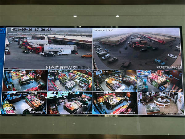▲新疆果业农产品交易中心大厅的实时监控图。人民日报记者白阳摄