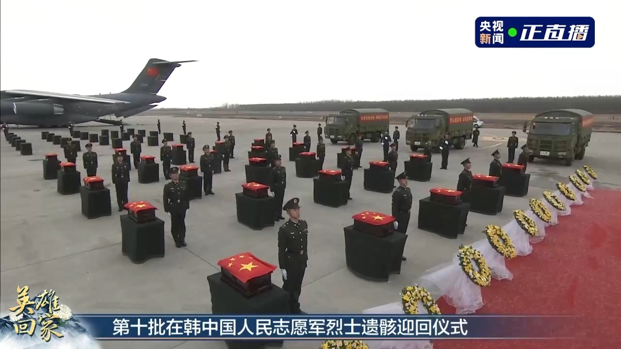 记者从退役军人事务部了解到,今天(11月23日)上午,第十批25位在韩中国人民志愿军烈士遗骸及遗物由空军专机护送从韩国接回辽宁沈阳。