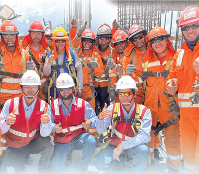 在中企承建的秘鲁库斯科圣安东尼奥国立大学升级改造项目施工现场,中秘两国建设者合影。水源 摄