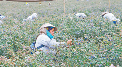 秘鲁特鲁希略市一家农场内,工人们在采摘蓝莓。人民日报记者 颜 欢摄