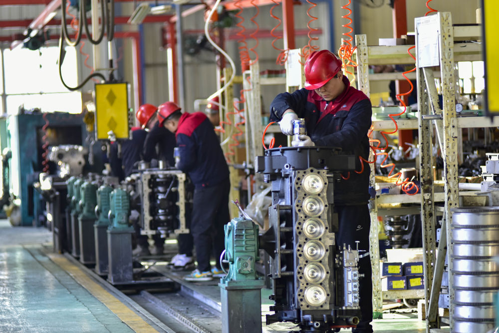 1月2日,工人在山东省青州市何官镇一家发动机制造企业的车间内工作。新年伊始,各地生产一线一派热火朝天的景象。新华社发(王继林摄)