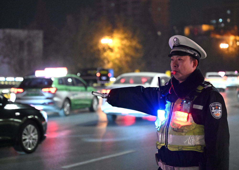 2025年1月1日,郑州交警一支队铁骑大队民警在郑州市紫荆山立交桥上执勤。新华社记者 李嘉南 摄