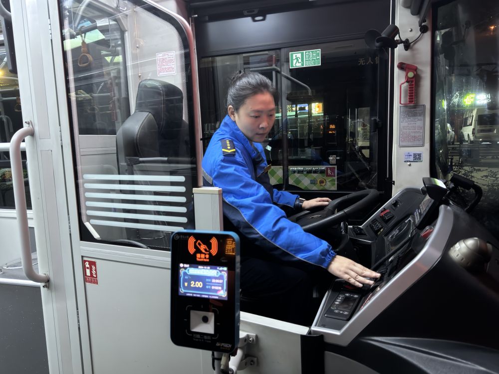 公交车驾驶员张红玫驾驶夜班公交接送乘客。