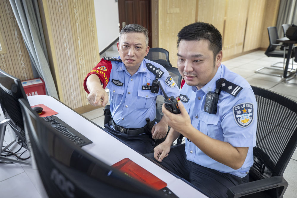 重庆铁路公安处沙坪坝车站派出所团结村警务区一级警长陈兵(左)在进行视频巡查。