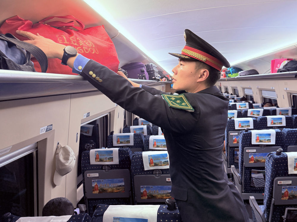 重庆客运段动车三队列车长王华在整理旅客行李。