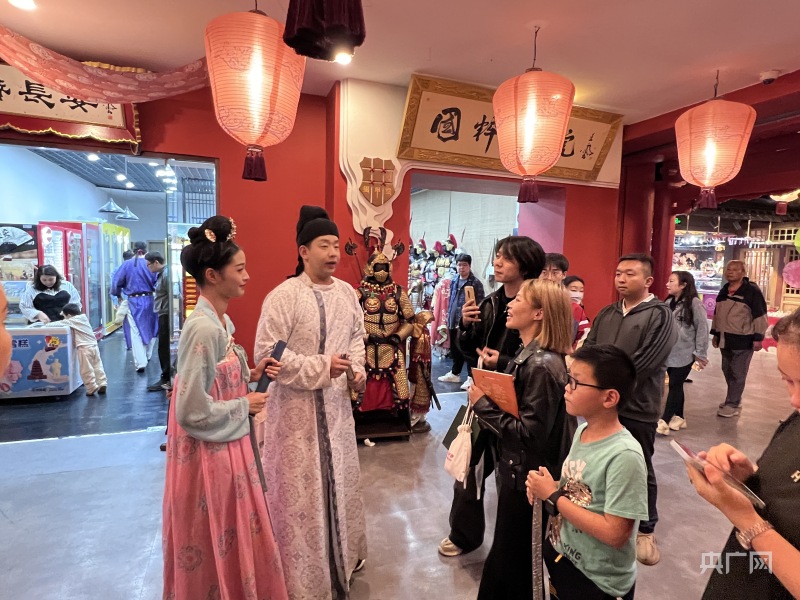 长安十二时辰主题街区内,几位演员(NPC:非玩家角色)正与游客互动(总台中国之声记者管昕摄)