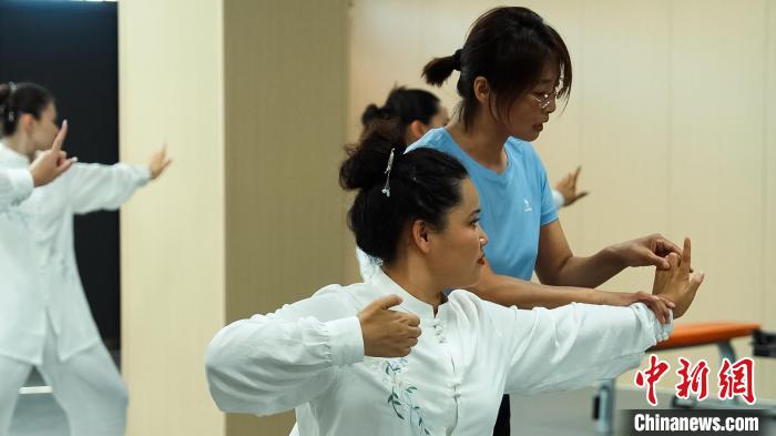 9月4日,哈萨克斯坦留学生奥宝在老师的指导下练习八段锦。 尹力 摄