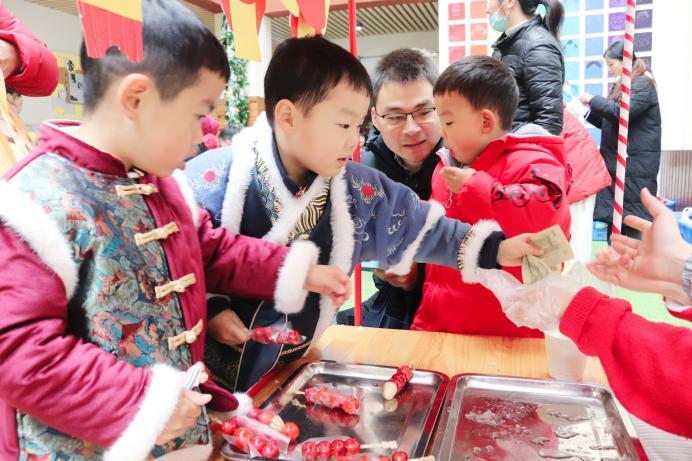 韵民俗之味,祈新年之福,悦传统之美。金茂悦幼儿园食堂为本次活动自研、自制美食,有爆米花、冰糖葫芦、银耳莲子羹、红豆桂花“小圆子”、苹果热橙茶、豆腐脑、卤香干、卤土豆等……香味四溢,深受家长和孩子们的青睐,快乐和满足更是随着孩子们的口水藏不住地往外溢。庙会结束后,“小老板”们一上午辛勤的收获可不是装进了自己的腰包哟,而是纷纷自觉地排起了长队,在募捐箱前争先恐后地献出爱心。