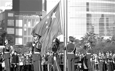 12月14日,广东边防五支队国旗护卫队战士在迎接澳门回归15周年升旗仪式上升起五星红旗。当日,来自粤港澳地区的一千多名青年学生在珠海拱北口岸参加升旗仪式。