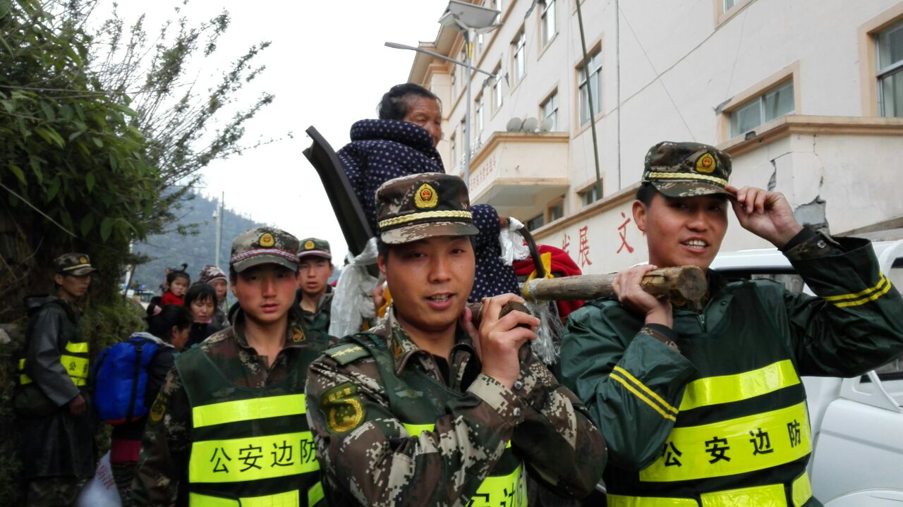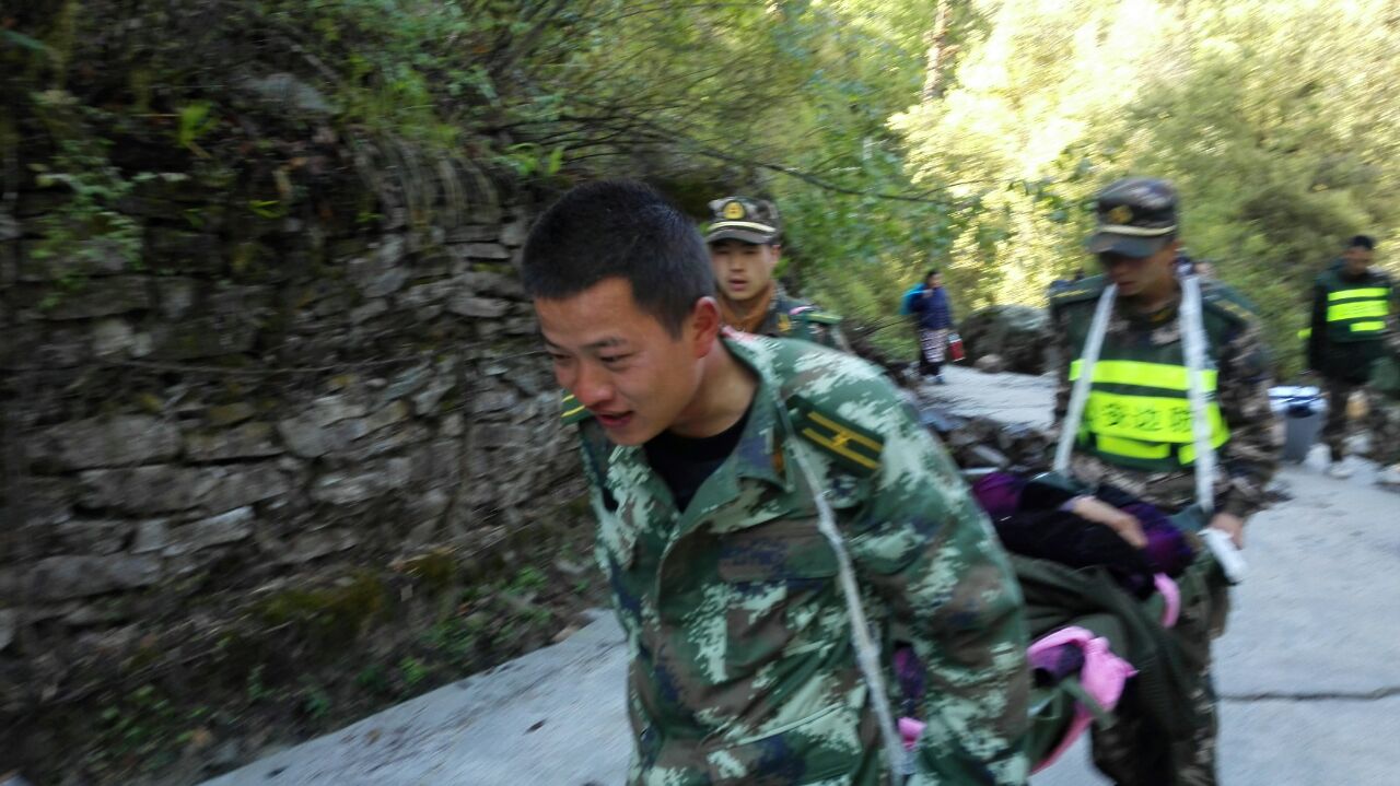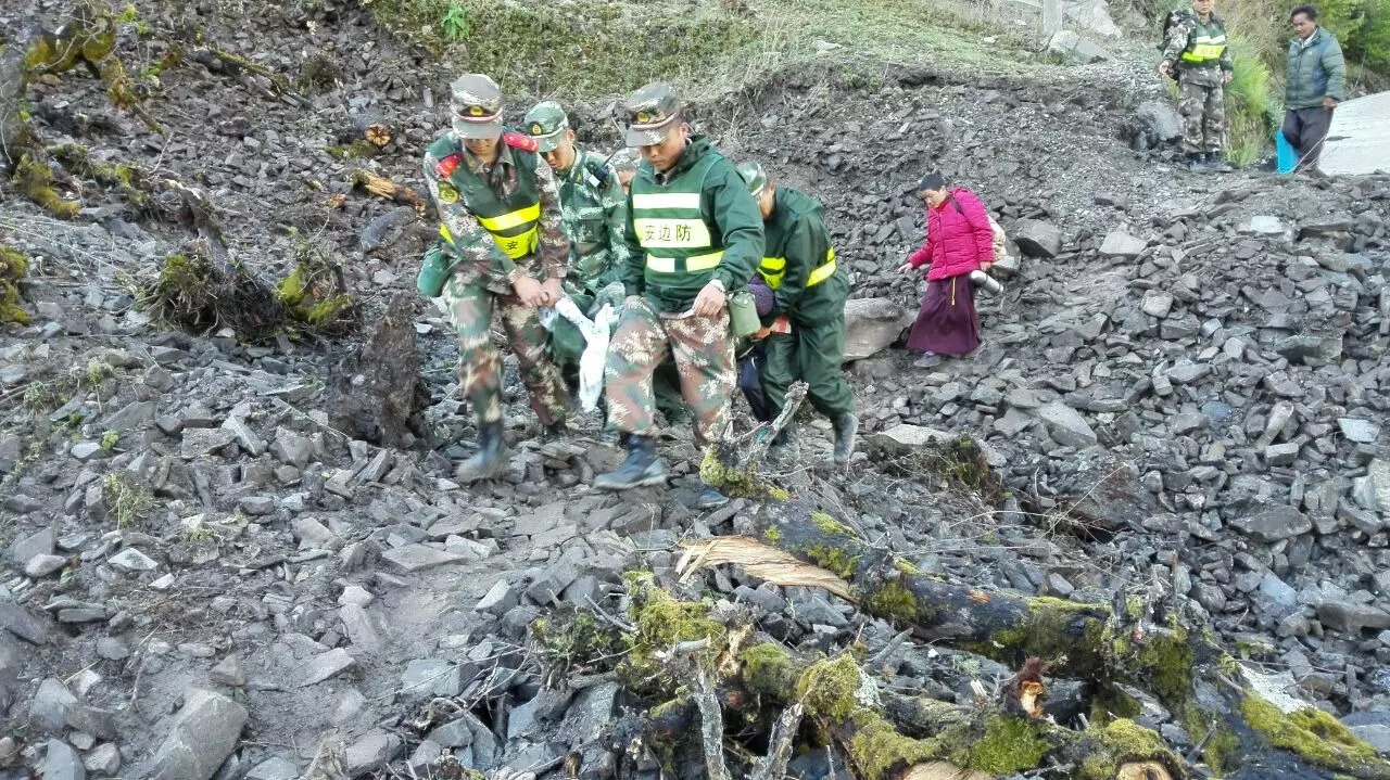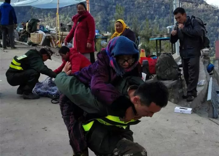 在得知撤离的消息后,驻村工作队的同志迅速协助当地官兵和边检救援队组织立新村民穿越塌方,他们背着老人,抬着担架冒雨向318国道方向前进。穿越巨大塌方带,不时伴随着轻微余震,滚石不断。立新村夏尔巴老人迪桑布,背着手走在队伍的最前面,休息的时候老人从胸前口袋掏出一片树叶放在鼻前闻着香味。老人什么行李都没带,唯独口袋里有个药瓶,里面装满了烟叶。他说,别的地方没有,这是家乡的味道。