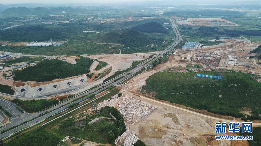 这是5月19日无人机拍摄的贵州省贵安新区“华为云”数据中心建设现场(以道路为界右)和腾讯贵安七星数据中心(左)。新华社记者 欧东衢 摄
