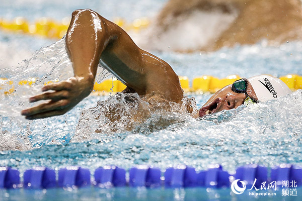 中国队第一棒选手汪顺在男子4x200米自由泳接力赛决赛中。