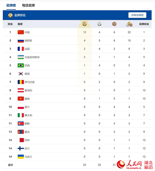 人民网武汉10月20日电 (周雯)19日,第七届世界军人运动会迎来开幕后的首个比赛日,有16个大项、共34个小项的比赛,产生了22枚金牌。截至19日23:00,中国队在射击、柔道、游泳、空军五项、击剑等项目中共获得12枚金牌,总奖牌数22枚,稳居奖牌榜首位,迎来名副其实的“开门红”。