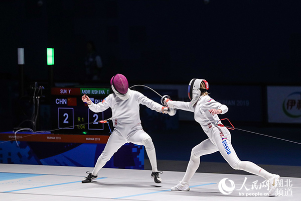 中国女子重剑选手孙一文(左)对阵俄罗斯选手ANDRIUSHINA TATIANA。