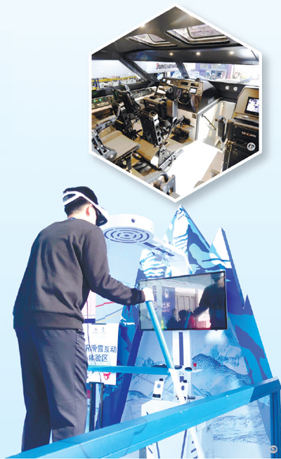 戴上VR眼镜,眼前是一片雪山滑道。按照工作人员的指示,开始“滑行”,然后“起跳”,整个人“飞”在空中,仿佛真的置身滑雪胜地,摘下眼镜,直呼“太爽”。在国家会展中心(上海)北广场的冰雪体验区里,不少观众用VR的形式,逼真地体验了一把“雪山飞行”的感觉。