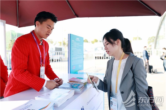 东方网记者夏毓婕、柏可林11月5日报道:今天早晨不到9点,来自哈尔滨的参展商韩建民跟同事在上海国家会展中心的入场安检通道外,开心地与进宝合影。“今年有幸拿到了首日贴,能够第一天进馆感到非常兴奋。”他告诉记者,激动澎湃的心情让自己早早醒了,赶着早班地铁要当最早入场的第一批。