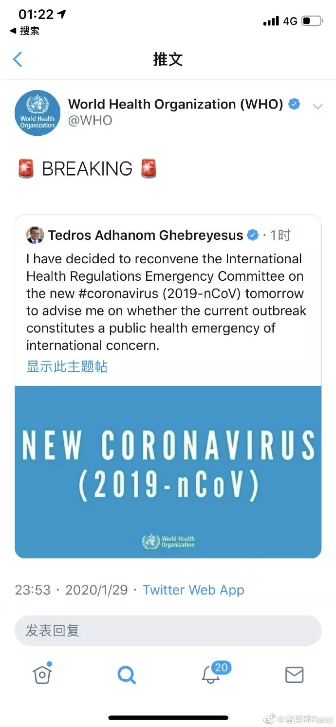 因为中国乃至全世界疫情的发展,WHO决定再次召开会议,决定是不是要把这次疫情列入PHEIC(国际健康紧急事件)。