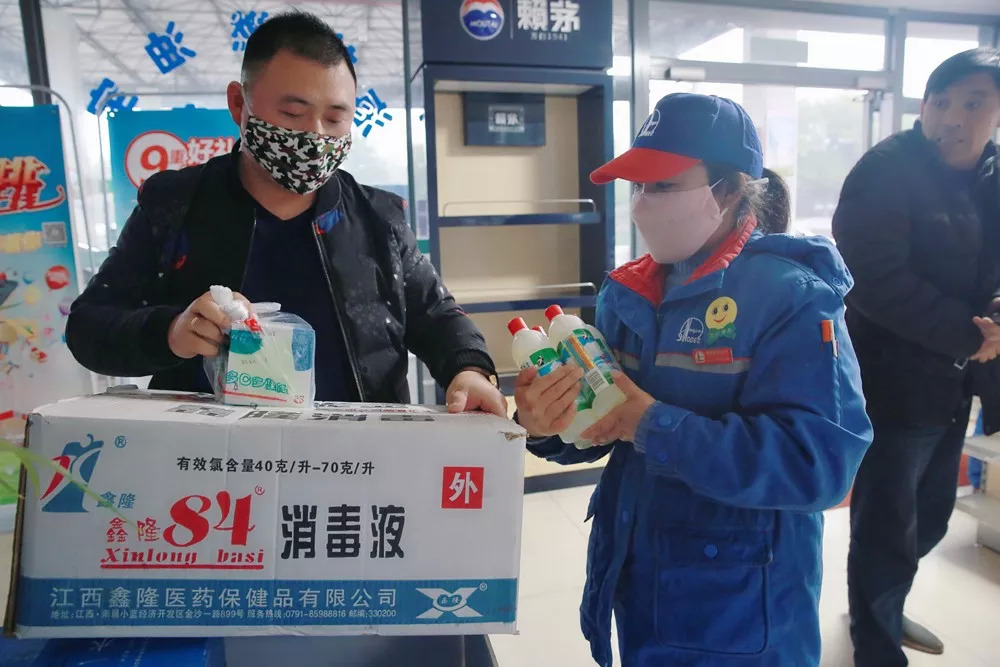 遵义石油启动应急方案,将偏远加油站库存较多的洗手液和84消毒液,调往人流密集、需求量大的加油站,并特意将这两种商品摆放在一起,方便客户选购;安庆石油大量购进专业防护口罩和各种抑菌洗手液、去菌剂等商品在易捷便利店内销售;丽水石油景宁、畲乡等加油站易捷便利店内均正常销售悦泰海龙车内除菌剂、室内除菌剂、免洗洗手液,保障客户需求。1月23日晚,中国石化天津石化公司紧急筹集5000只防护口罩,连夜打包封装,发往武汉,于1月26日运抵。