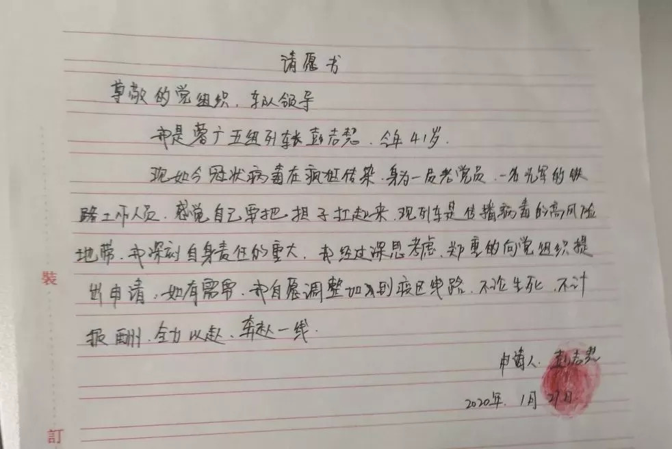 面对当下的疫情,彭志慧希望能做一些自己力所能及的事,在得到了丈夫与儿子的理解后,写下了自愿出乘通过疫情严重区域线路的请愿书。