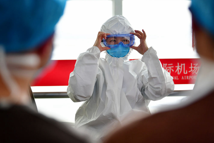 1月28日,甘肃中医药大学附属医院重症医学科护士长徐小艳(中)在出发前为同伴演示防护装备穿戴。新华社记者 陈斌 摄