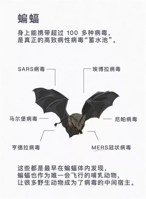 尼帕病毒:尼帕病毒同样来自蝙蝠,是由于人类将养猪场建在了蝙蝠栖息地的旁边,被蝙蝠咬过、染有病毒的水果掉到了猪圈里,猪吃了以后感染病毒,继而再把病毒感染到人。