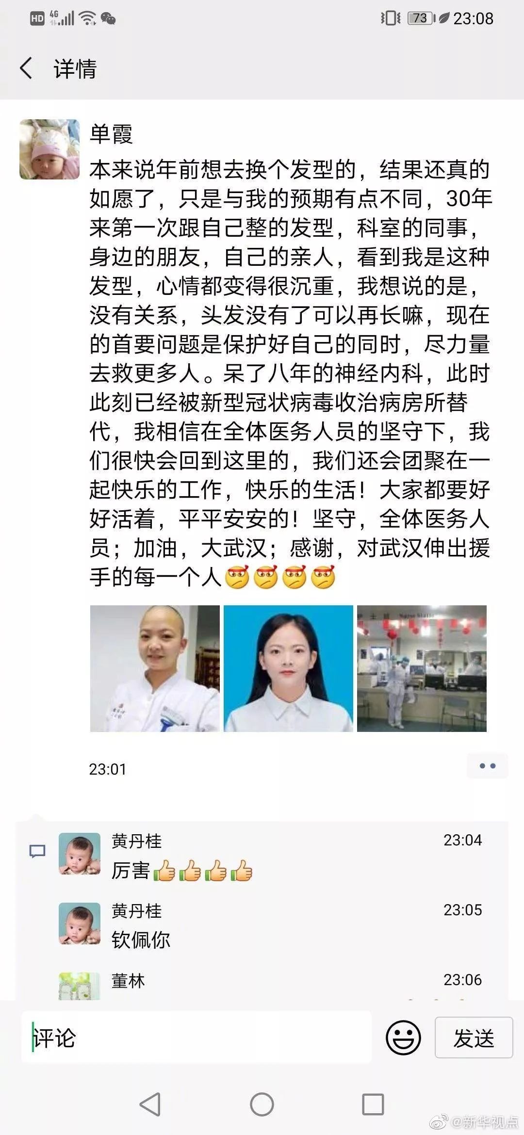 为了避免交叉感染,节约穿脱防护衣帽的时间,两个孩子的母亲、人民医院护士单霞毅然剪掉了自己的长发。“用我及腰长发,换你健康平安”。