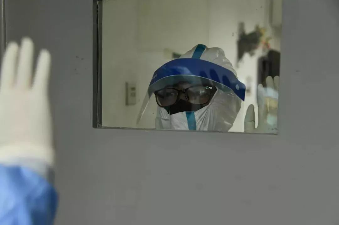 1月24日,在武汉大学中南医院重症隔离病房,医护人员相互加油鼓劲。