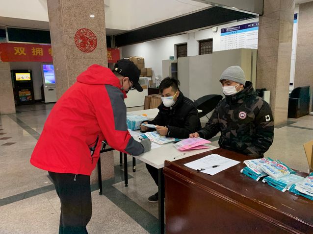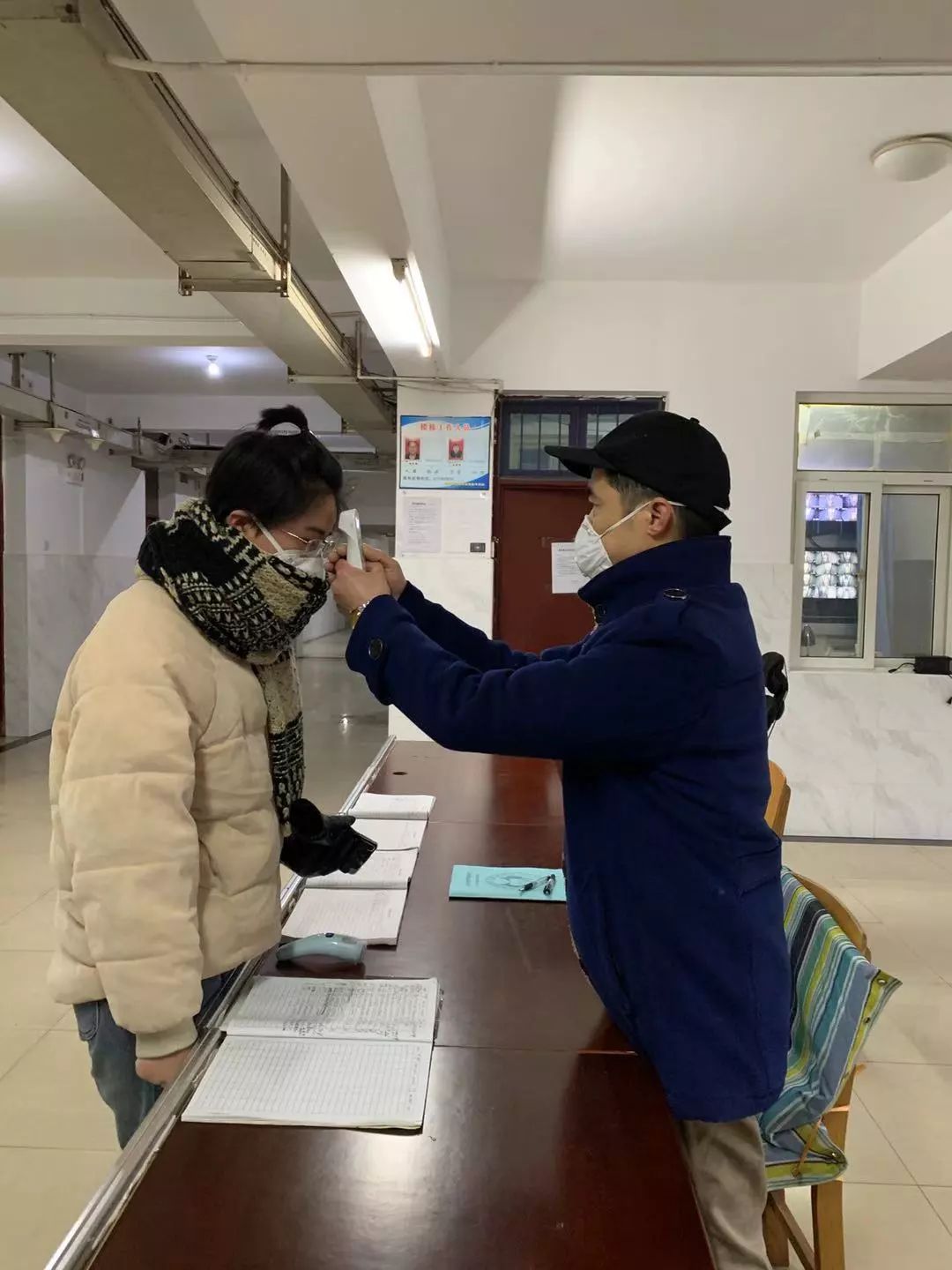 华中农业大学宿舍区工作人员在为留校学生测量体温。