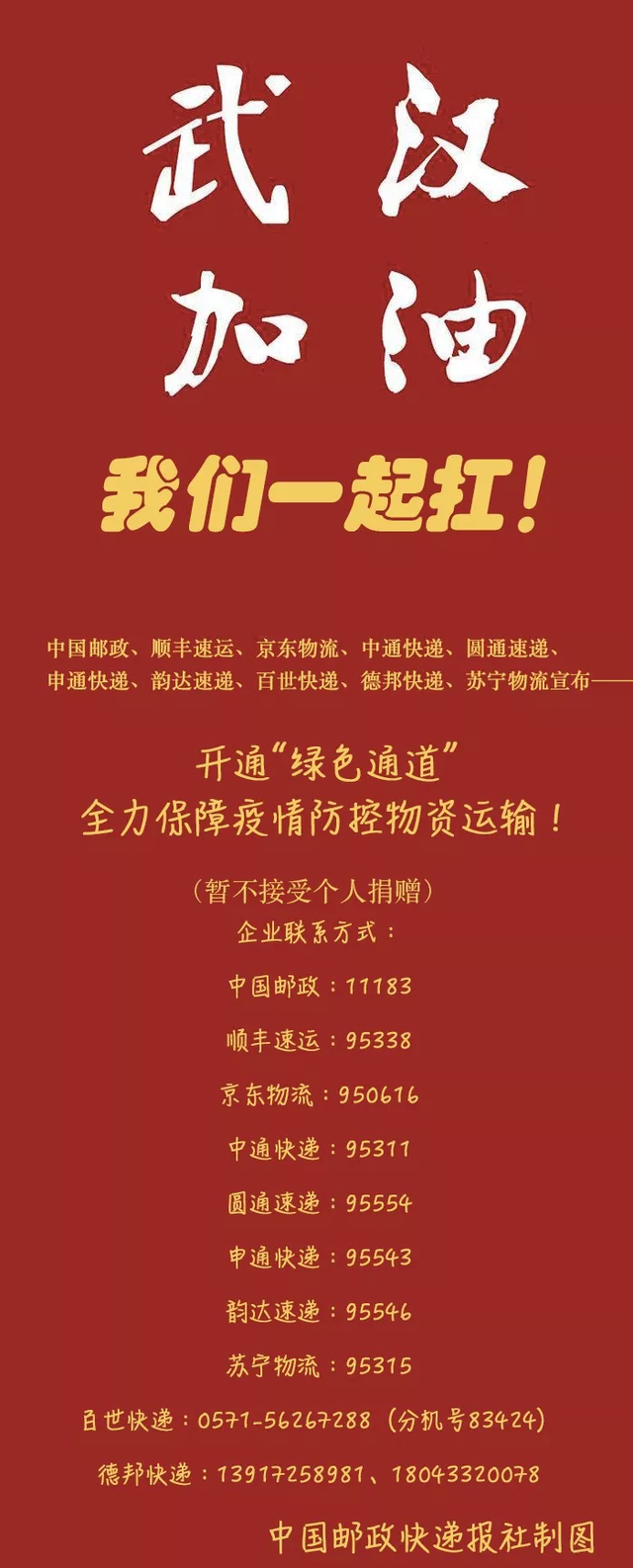一方有难,八方支援!1月25日大年初一,针对武汉等地的疫情,中国邮政、顺丰速运、京东物流、中通快递、圆通速递、申通快递、韵达速递、百世快递、德邦快递和苏宁物流宣布,将开通全国各地驰援武汉救援物资的特别通道,全力保障疫情防控相关物资运输。