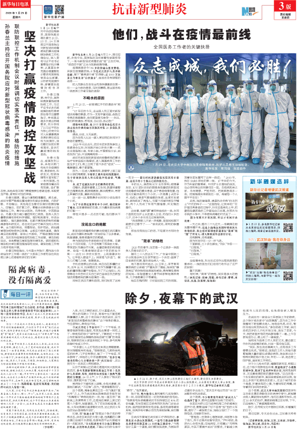 刚过去的除夕夜,与往年有些不同。新型冠状病毒感染的肺炎疫情仍在发展,武汉的各种消息牵动人心。令人印象深刻的是,春晚节目单上临时增加了由白岩松、水均益、康辉等6位知名主持人带来的情景报告节目《爱是桥梁》。这个唯一没有彩排的节目,展现了武汉人民坚强面对新型冠状病毒感染的肺炎疫情、医护人员忘我救治的场景。