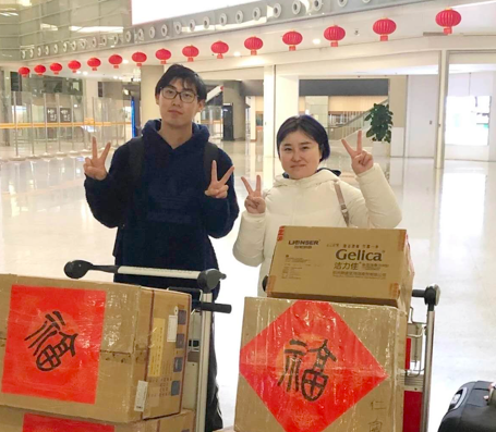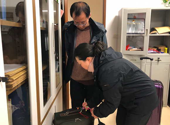 老公来送行,交代细节,果敢的护士长给行李箱绑上同事送的幸运结