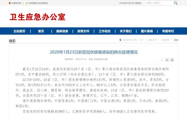 卫生应急办公室公布2020年1月23日新型冠状病毒感染的肺炎疫情