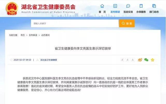 7日上午,湖北省卫生健康委员会向李文亮医生表示深切哀悼:获悉武汉市中心医院眼科医生李文亮在抗击疫情中不幸感染新冠肺炎,经全力抢救无效不幸去世。省卫生健康委向李文亮医生表示深切哀悼,并向其家属表示诚挚慰问!向一直奋战在抗疫一线的全体医务工作者表示崇高敬意!值此抗疫关键时期,希望全体医务人员在抗击疫情的战斗中切实做好防护工作,更好地为人民群众健康服务,坚定信心、齐心协力打赢这场防疫阻击战!