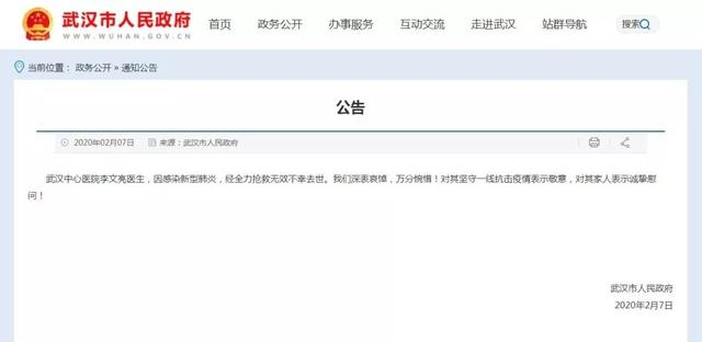 7日上午,武汉市政府网站发布公告:武汉中心医院李文亮医生,因感染新型肺炎,经全力抢救无效不幸去世。我们深表哀悼,万分惋惜!对其坚守一线抗击疫情表示敬意,对其家人表示诚挚慰问!
