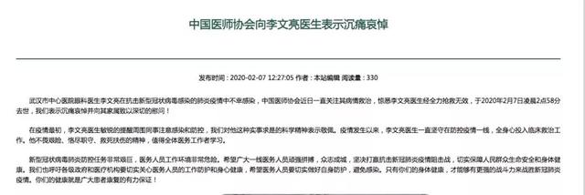 武汉市中心医院眼科医生李文亮在抗击新型冠状病毒感染的肺炎疫情中不幸感染,中国医师协会近日一直关注其病情救治,惊悉李文亮医生经全力抢救无效,于2020年2月7日凌晨2点58分去世,我们表示沉痛哀悼并向其家属致以深切的慰问!