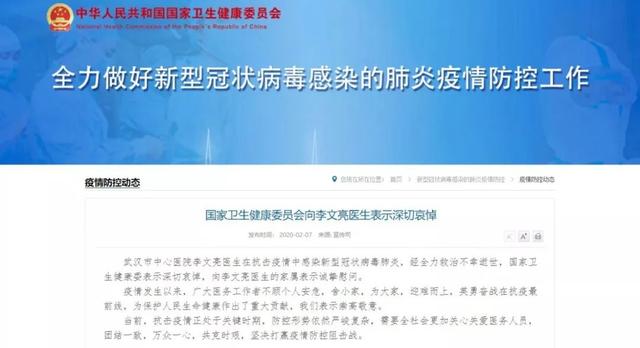 7日,国家卫健委向李文亮医生表示深切哀悼: 武汉市中心医院李文亮医生在抗击疫情中感染新型冠状病毒肺炎,经全力救治不幸逝世,国家卫生健康委表示深切哀悼,向李文亮医生的家属表示诚挚慰问。疫情发生以来,广大医务工作者不顾个人安危,舍小家,为大家,迎难而上,英勇奋战在抗疫最前线,为保护人民生命健康作出了重大贡献,我们表示崇高敬意。当前,抗击疫情正处于关键时期,防控形势依然严峻复杂,需要全社会更加关心关爱医务人员,团结一致,万众一心,共克时艰,坚决打赢疫情防控阻击战。